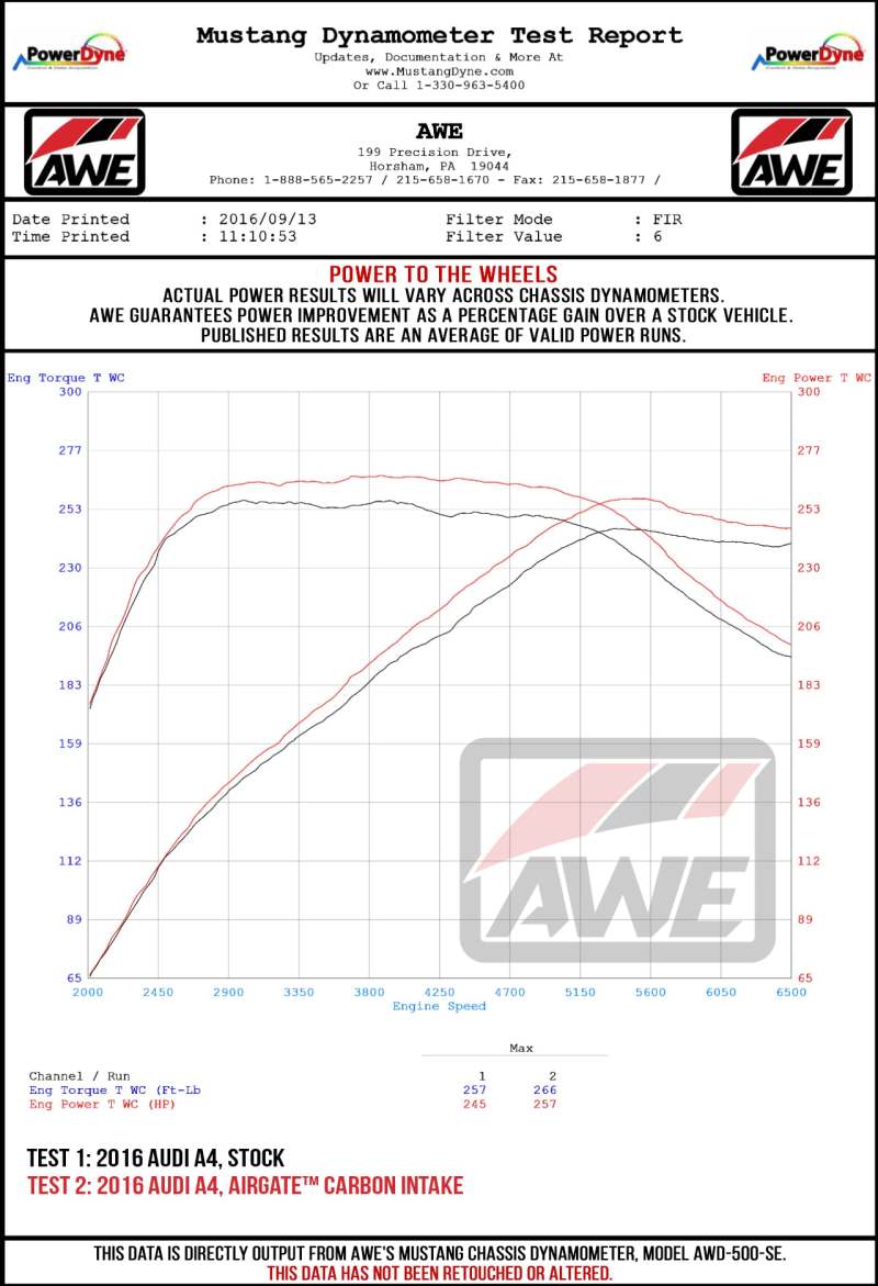 Break the mold with AirGate™. The AirGate™ Carbon Intake for the B9 A4/A5 The AirGate™ Carbon Intake allows options for those seeking more volume from their intake when under boost. Want to hear more turbo inductions sounds from within the cabin? Go lidless. Prefer to keep it a bit more stealthy? Simply bolt the AirGate™ lid in place with a few turns of two easily-accessible hex screws. Constructed of genuine 2x2 carbon fiber with a UV-stabilized resin and clear coat, the AirGate™ Carbon Intake mounts securely to the stock location and integrates with the factory ducting perfectly via the AirGate’s floating airbox inlet. The S-FLO Filter The included AWE S-FLO Filter is designed specifically for this air box to be easily serviceable and to maximize airflow. This increase in airflow unlocked maximum gains of 12 hp and 9 lb-ft of torque at the wheels. The combination of carbon fiber airbox and included S-FLO Filter makes for a more aggressive intake note, with an intoxicating turbo spool sound. Please Note: AWE AirGate Intakes are for Racing Use Only.