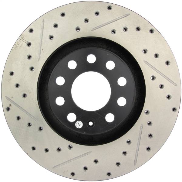 StopTech Drilled and Slotted Sport Rotors are 1-piece direct replacement brake discs for factory brake systems and stock calipers that look great behind your wheels – and offer significantly improved braking performance. The unique cross-drilling and slotting aids with heat and brake dust dispersal; prevents glazing of the pads; adds bite and improves wet and dry braking performance. Built to last; the black e-coating provides protection from corrosion and the high carbon metallurgy (in most applications) offers quieter operation; better crack resistance and increased performance.