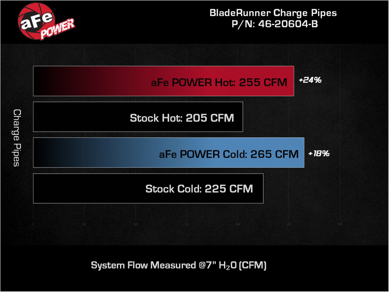 Smooth transitions in the mandrel-bent aluminum pipes decrease turbulence and minimize pressure loss, increasing horsepower and torque. This charge pipe kit provides a smooth transition between the turbo and the engine for lower operating temperatures and increased power. This kit includes high-quality, stainless-steel, spring-loaded T-bolt clamps and heavy-duty, 5-ply, polyester reinforced silicone couplings for superior strength and durability. Finished in wrinkle black powder coating with a unique laser-etched aFe POWER logo for a custom look.